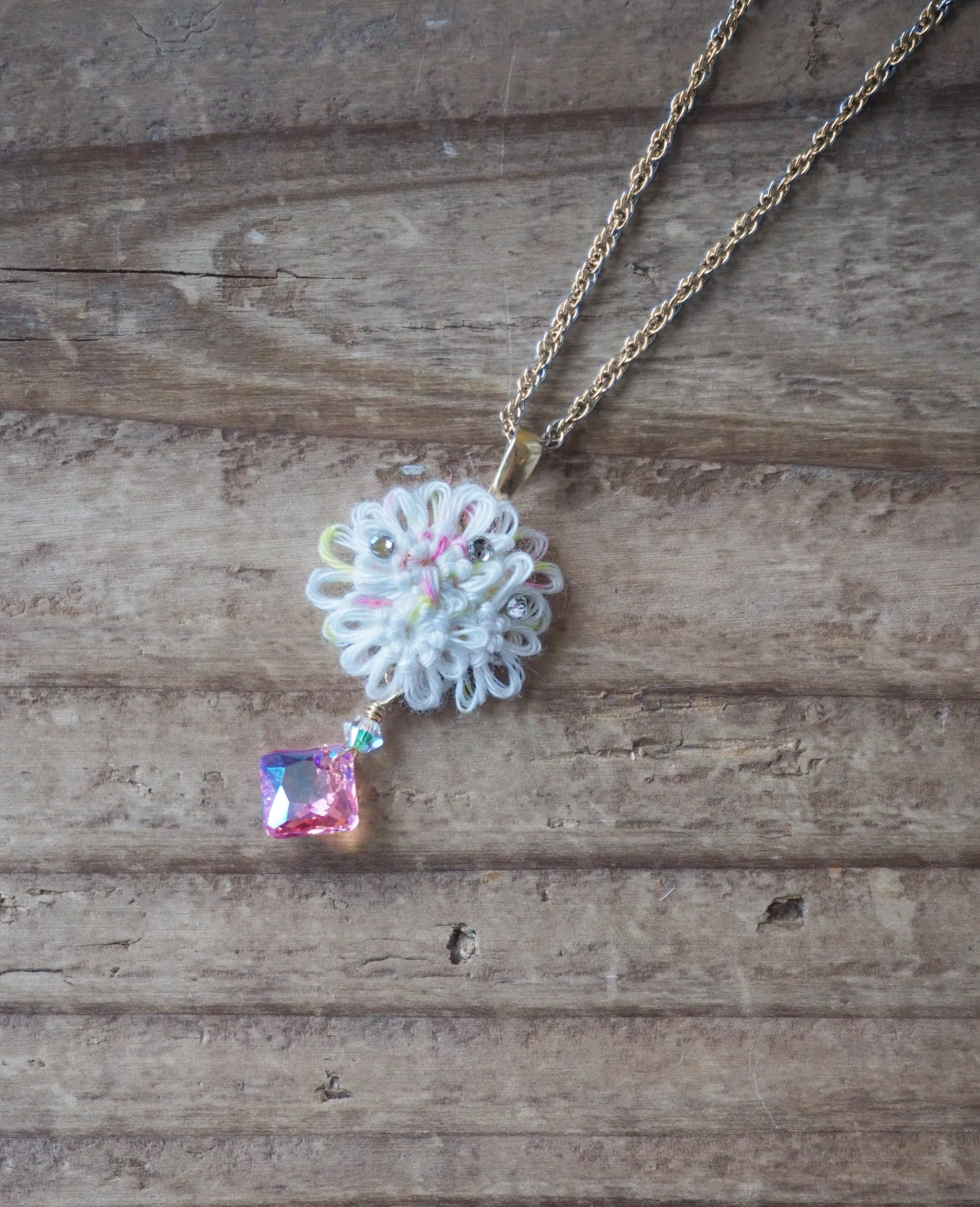 ピンク、黄色が混じった白くふんわりした糸でお花を編みました。