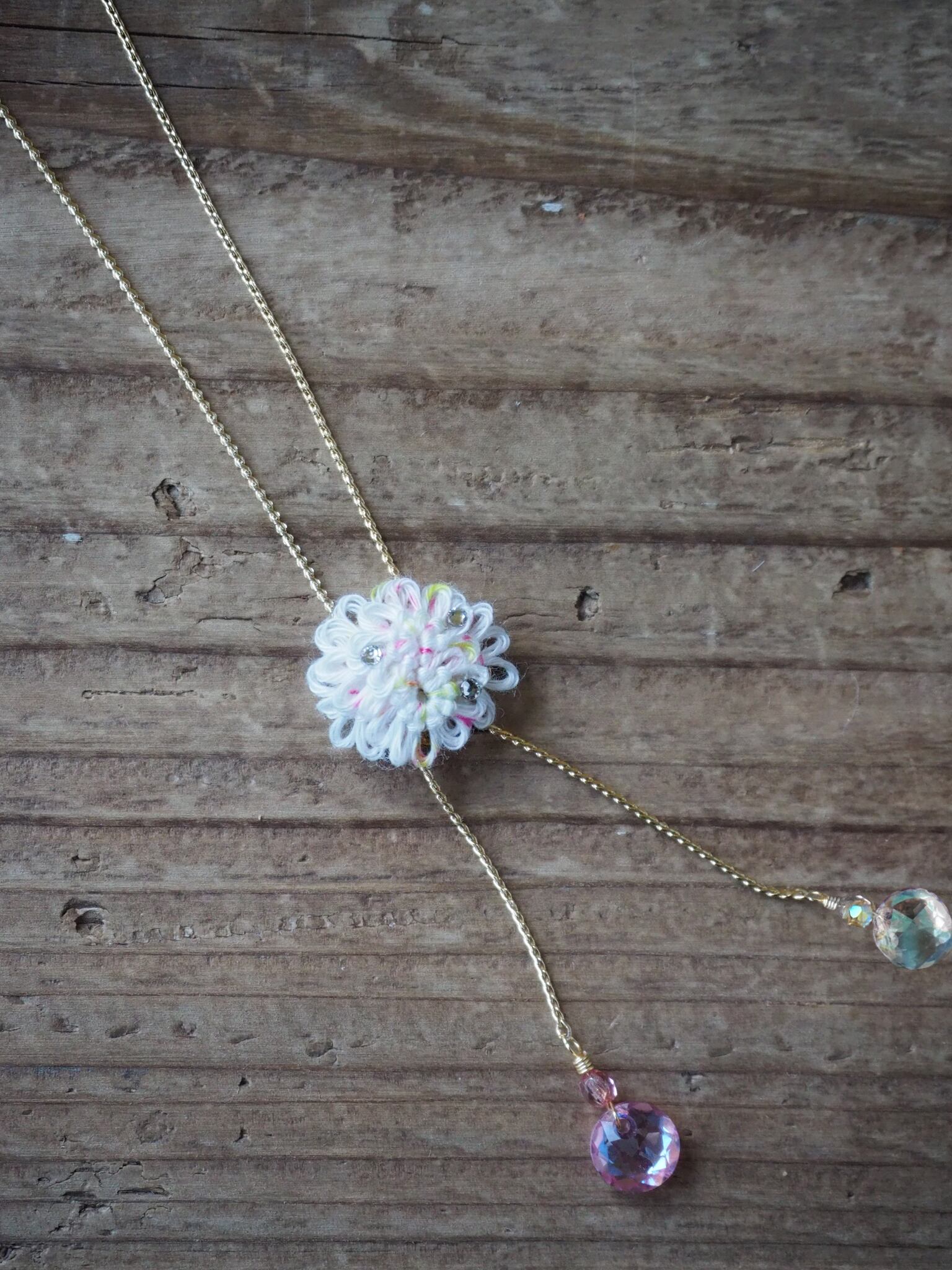 ピンク、黄色が混じった白くふんわりした糸でお花を編みました。