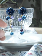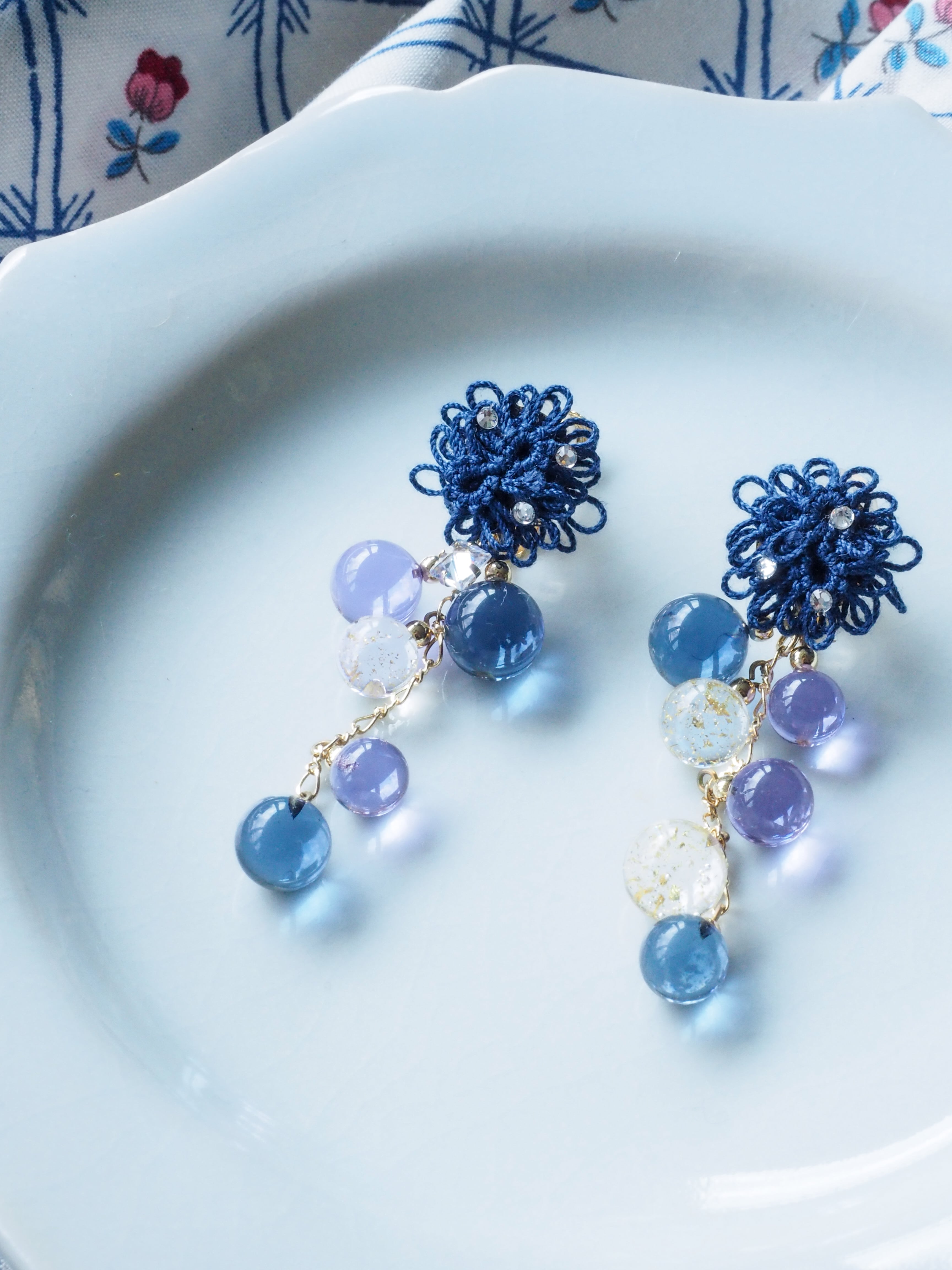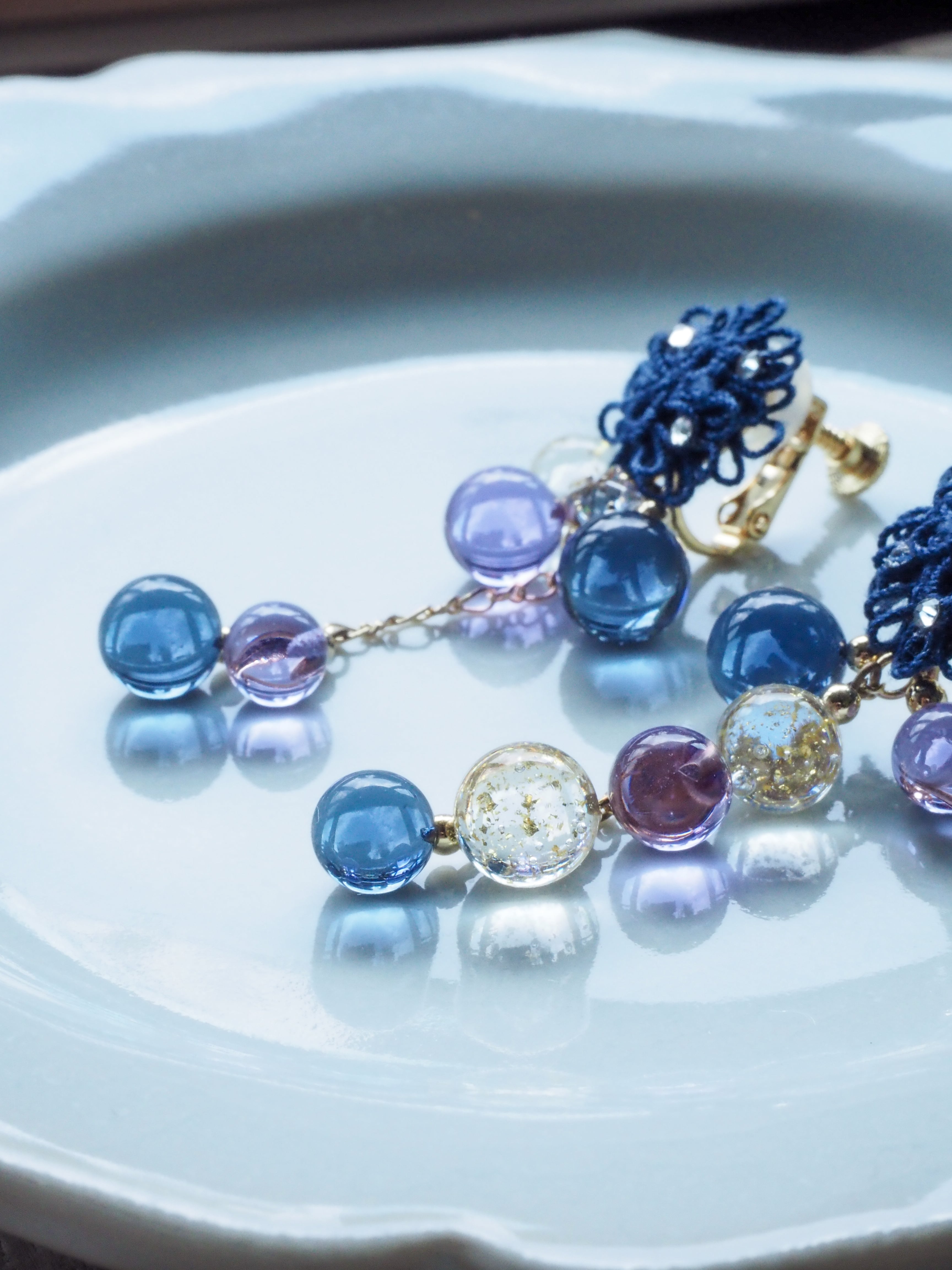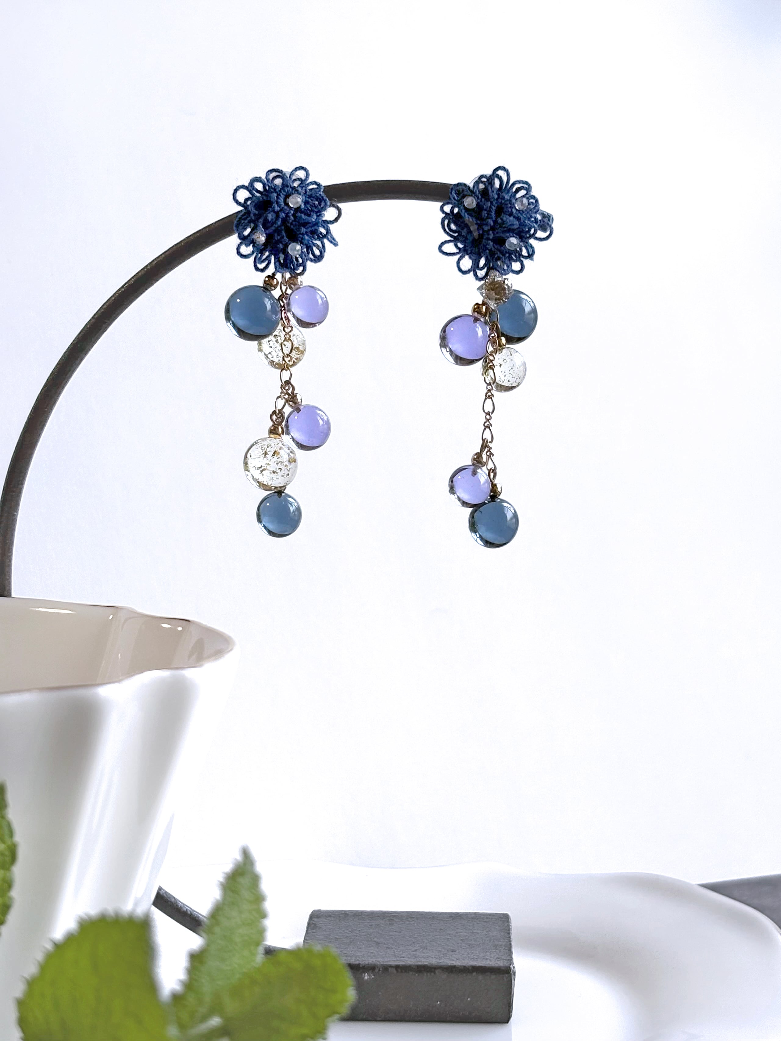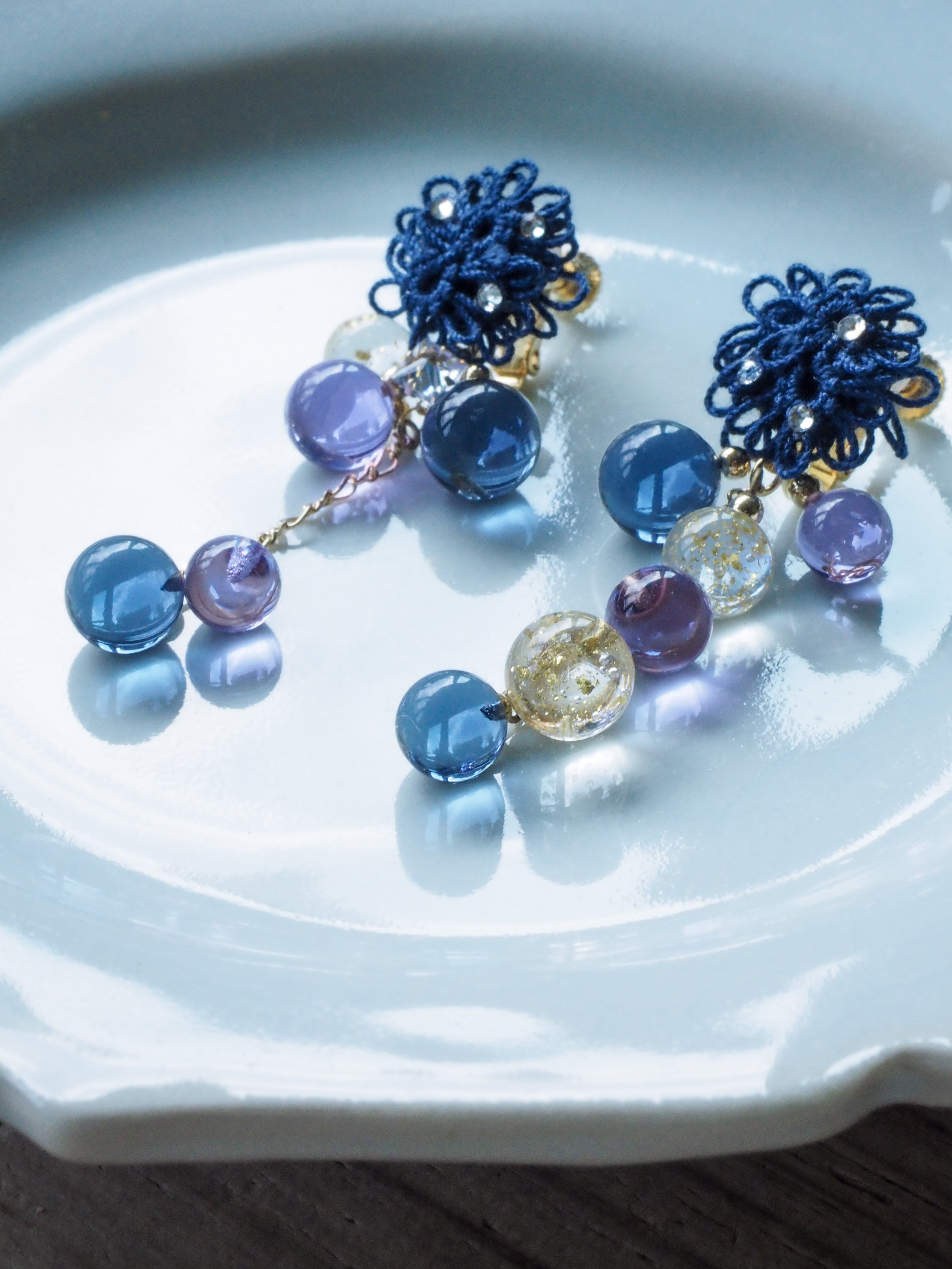 ◇ネイビーの糸で編んだレースのお花と、夜空に浮かぶ夢のような硝子のコラボアイテムです。