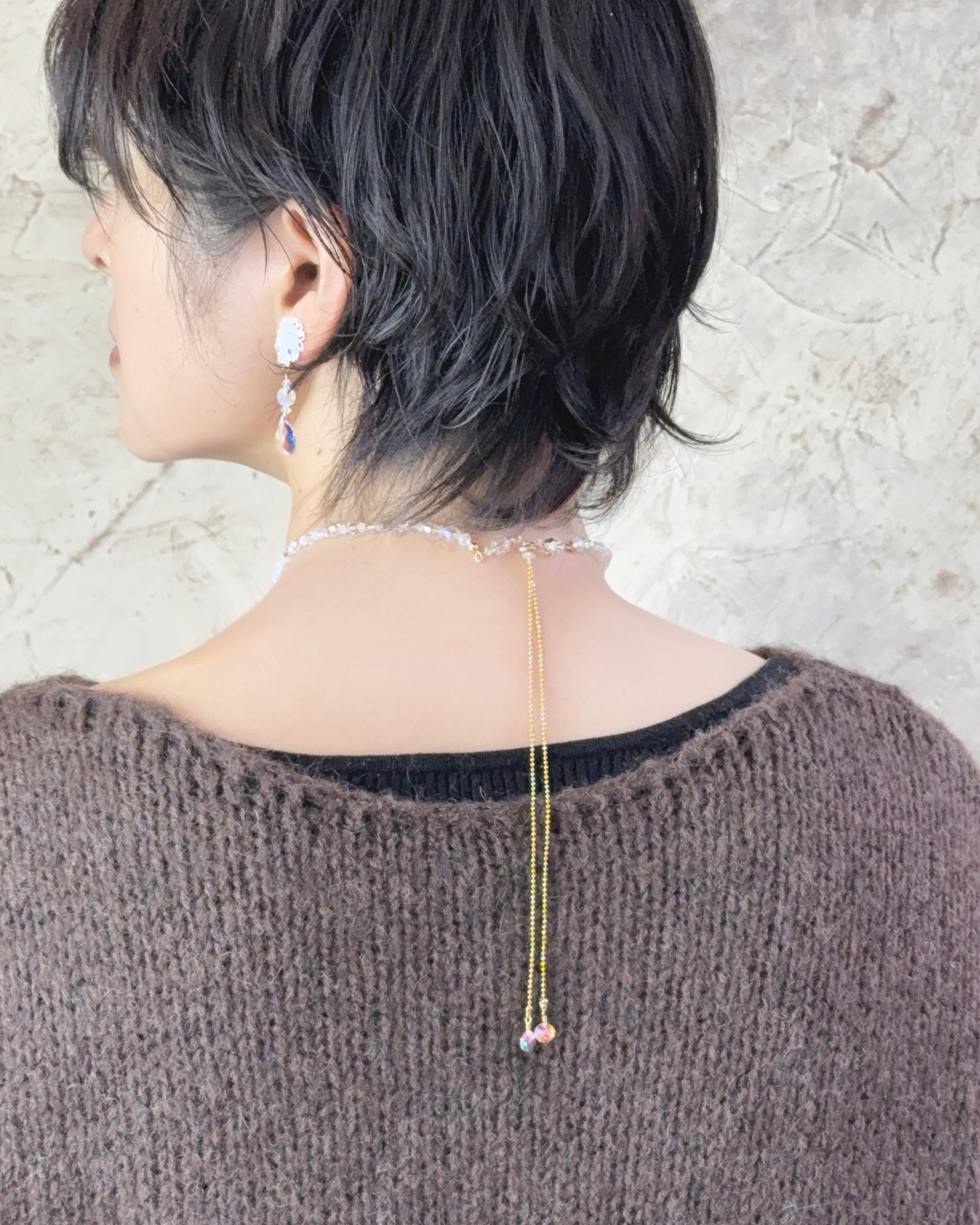 ネックレスの長さは、チョーカー風にもロングタイプにも変えられる2WAY仕様。