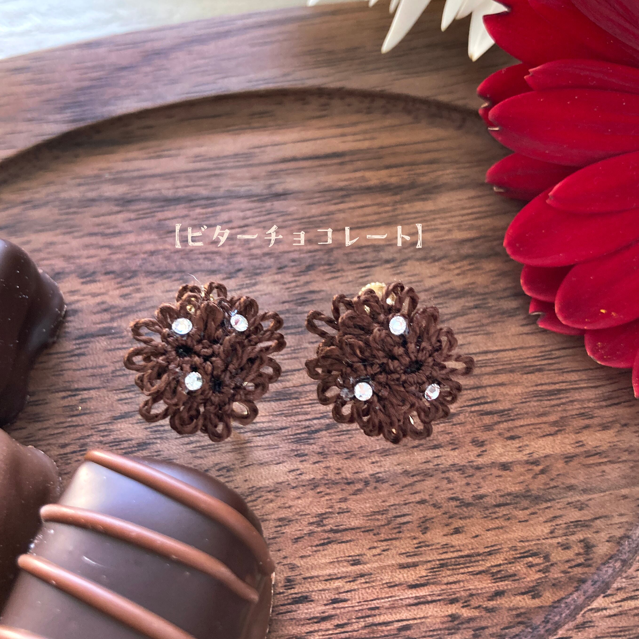 「チョコレートコスモス」をふっくらしたレースのお花で作りました。